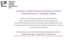 Od 15 XI 2025 r. w Bibliotece Szkolnej dla klas 4-8 prezentowane są nowości książkowe zakupione w ramach Narodowego Programu Rozwoju Czytelnictwa na lata 2021-2025. Wystawa będzie czynna do 19 XII 2025 … [Więcej ...] czytaj więcej o WYSTAWA NOWOŚCI KSIĄŻKOWYCH ZAKUPIONYCH ZE ŚRODKÓW Z „NARODOWEGO PROGRAMU ROZWOJU CZYTELNICTWA NA LATA 2021-2025.”
